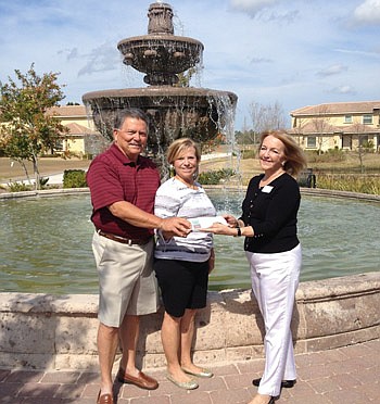 Lenny and Pat Klinck, pictured with Homes by Deltona Sales Consultant Jennifer Morgan, won a drawing for a “Stay and Play” opportunity at Laterra Links at World Golf Village. The couple entered a drawing to win a two-day, one-night “Stay and Play” at the Homes by Deltona coach home community in World Golf Village. The Klincks received accommodations at Laterra Resort and two passes to play at the renowned King & Bear golf course.
