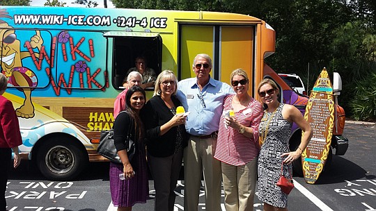 Toll Brothers representatives recently visited Ponte Vedra Beach offices on a hot day to pass along information on their Coastal Oaks at Nocatee community and brought along a food truck to serve Hawaiian Shaved Ice. Here’s one gathering: Farhana Hasan, Pam Belcher, Doug Mathewson and Sarah Hewett of Prudential Network Realty, and Erin Morgan Masters of Toll Brothers.