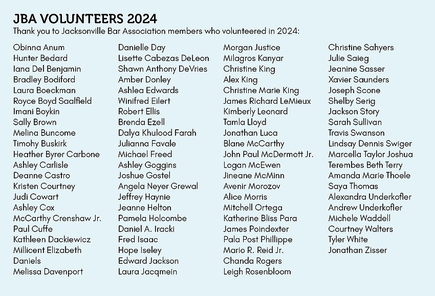 In anticipation of the National Celebration of Pro Bono Oct. 19-25, Jacksonville Area Legal Aid, the Jacksonville Bar Association’s Pro Bono Committee and Three Rivers Legal Services offer a “thank you” to members of the JBA for their dedication and volunteer service to the vulnerable and underserved in our community in the past year.