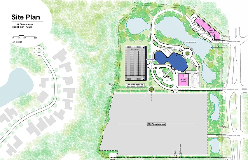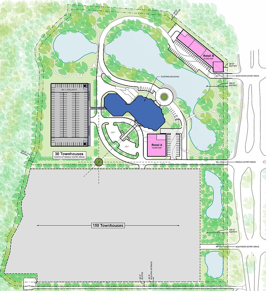 In the new proposal, 150 of the residential units will be south of the middle entry drive, which splits the property between the retail and hotel space, and those residential units. Thirty of the residential units will be north of the middle entry drive, but separated from the hotel and retail spaces by a driveway.