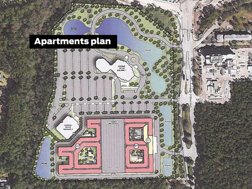 Trevato bought the property south of Butler Boulevard at San Pablo Road South from Allstate for $20 million in May 2024. The 29.77-acre site includes two office buildings that would remain.