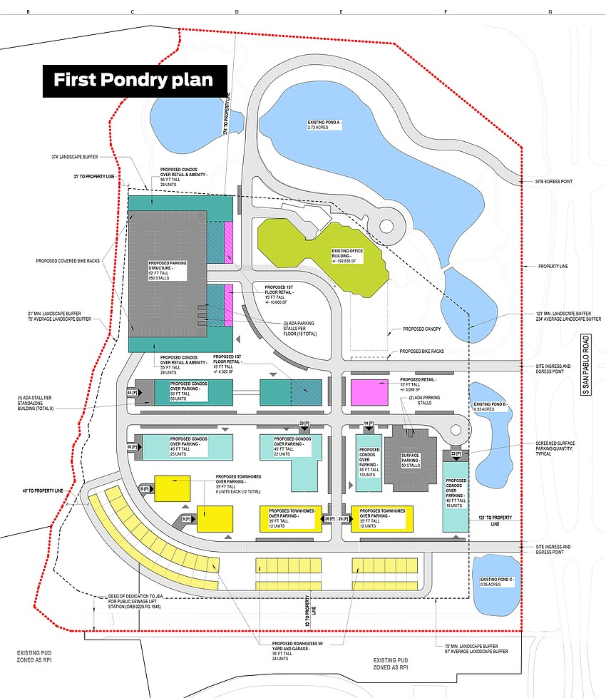 A revised plan from Trevato Development Group for the mixed-use redevelopment of the former Allstate Campus office park in South Jacksonville is headed to the Jacksonville City Council Land Use and Zoning Committee after being approved Oct. 9 by the Planning Commission.