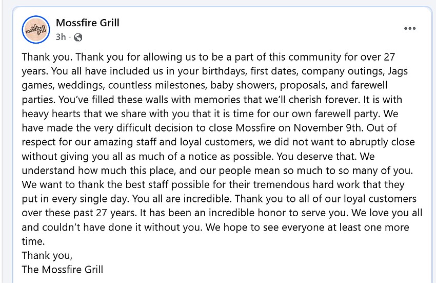 The post, signed “The Mossfire Grill,” did not offer a reason for the closure.